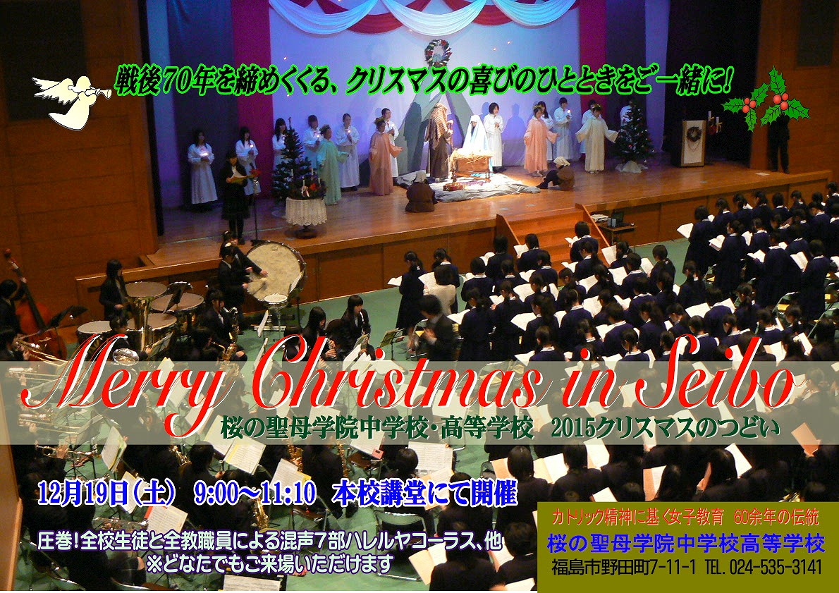 12月19日(土)午前9時から11時頃まで、中学・高校全生徒で作る「クリスマスのつどい」が開かれます。毎年保護者の皆さまをはじめ、広く一般の方々にも参加をしていただいております。ご興味のあるかたは是非、ご来場ください!