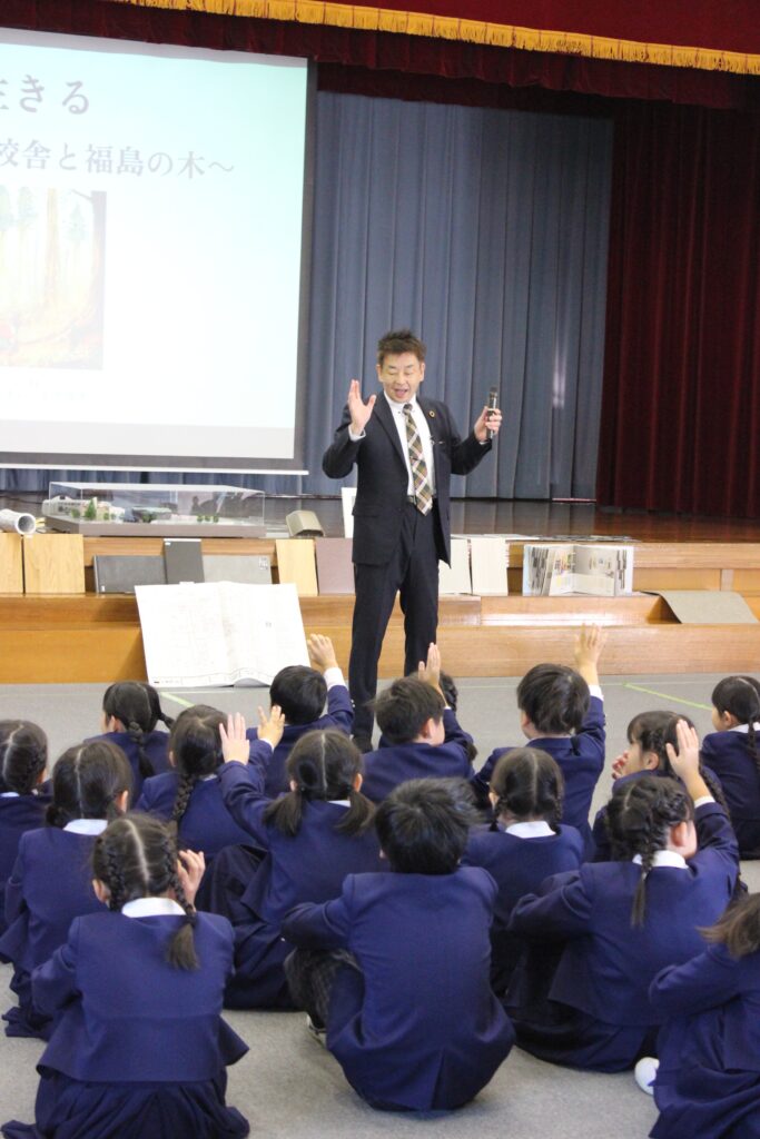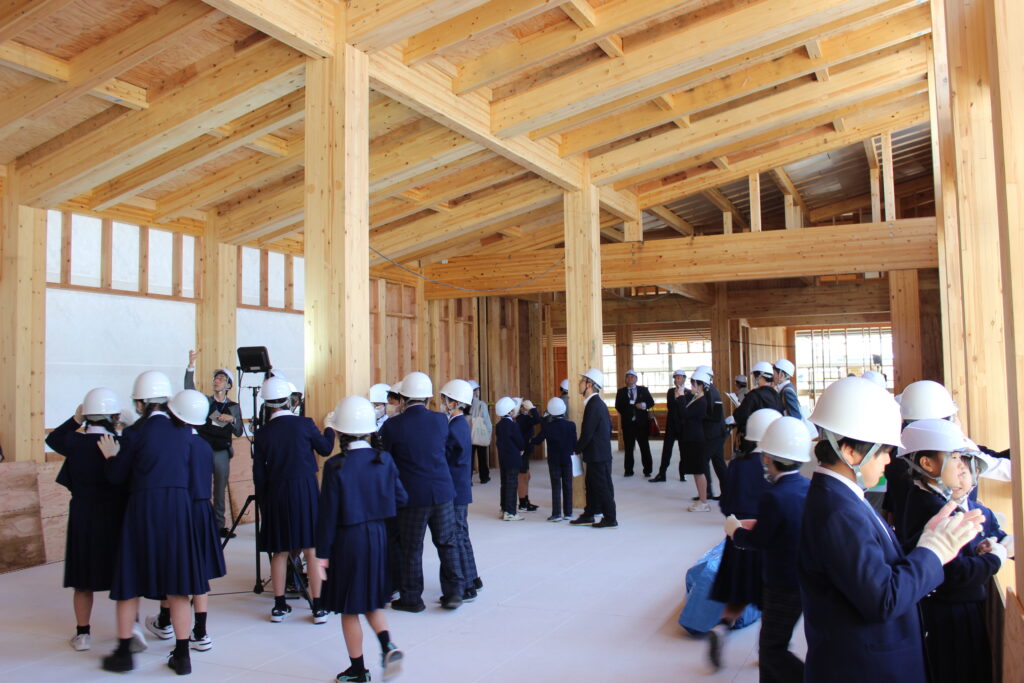 三井ホームの設計責任者、玉井一行様より「木と生きる」というテーマでお話をして頂き、建設中の中学校校舎の中を見学しました。