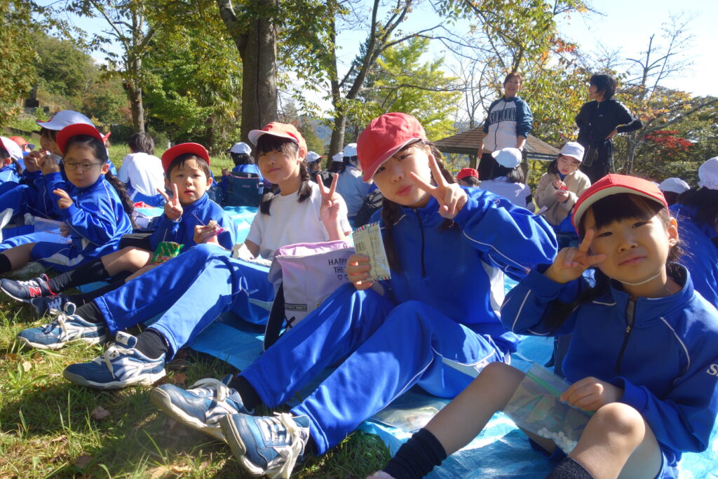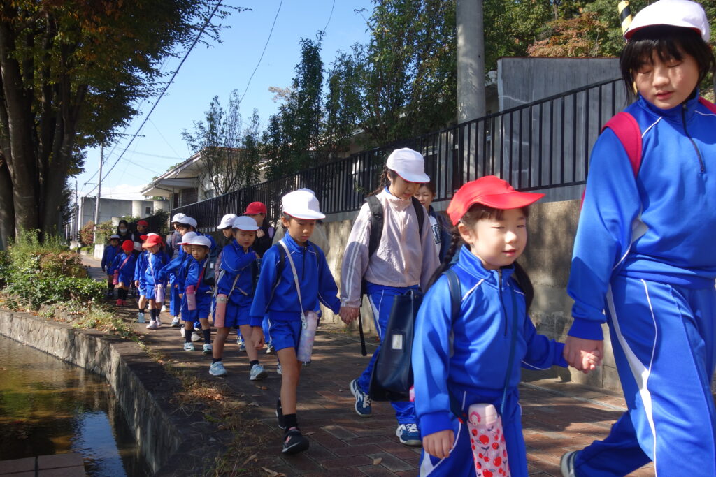 10月23日(木)秋晴れのよいお天気の中、年長組と5年生が、園外で幼小交流をしました。