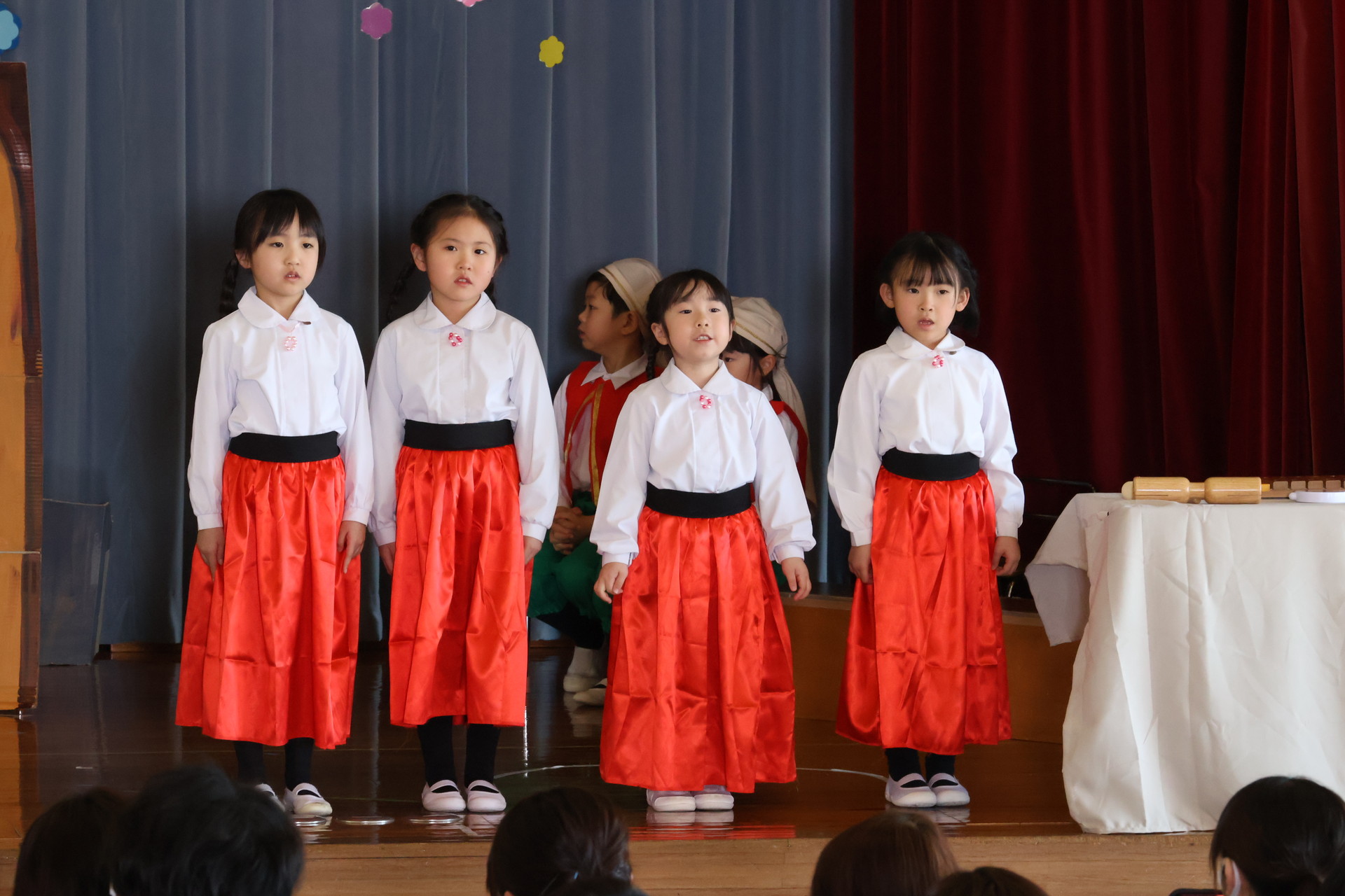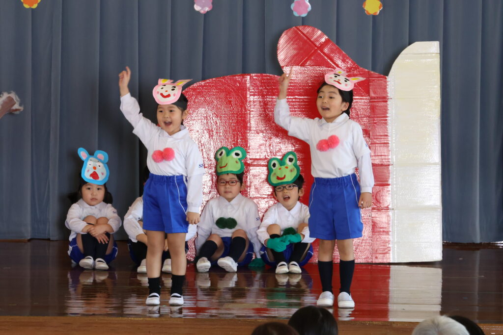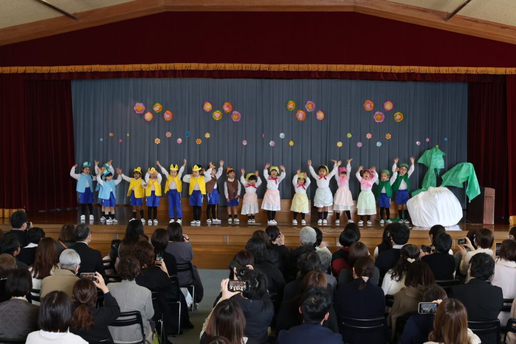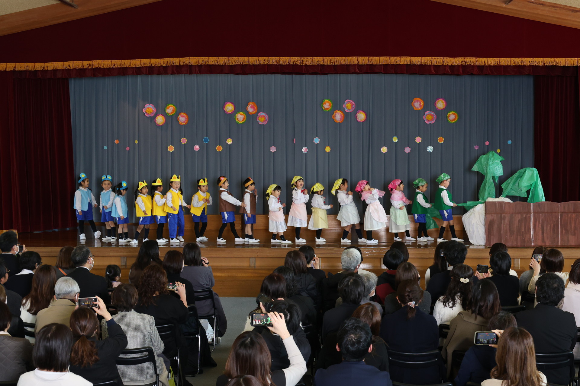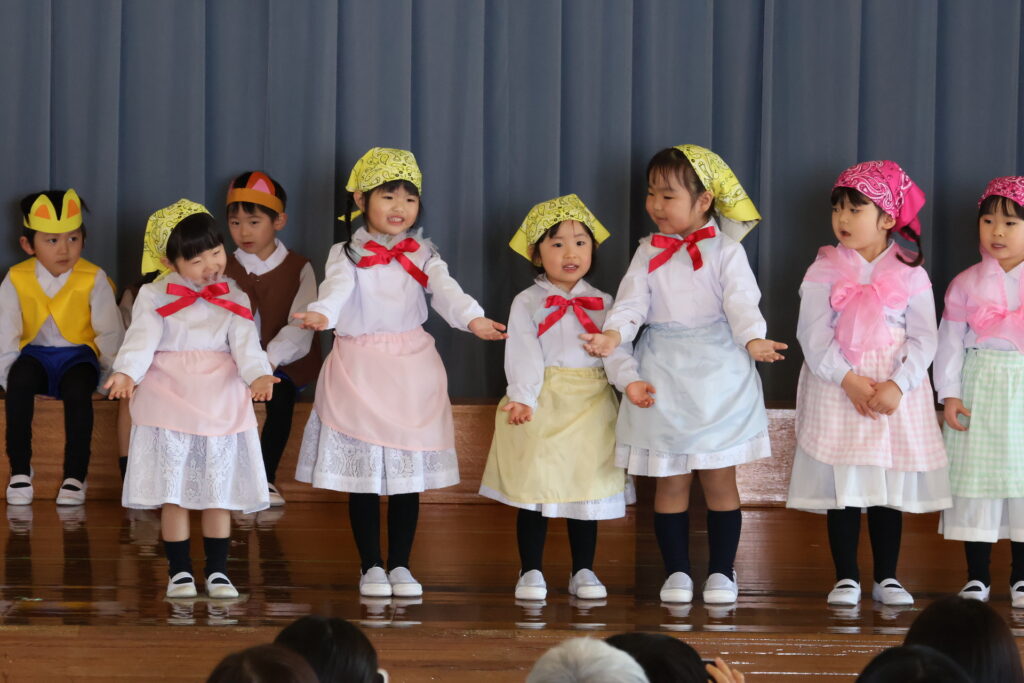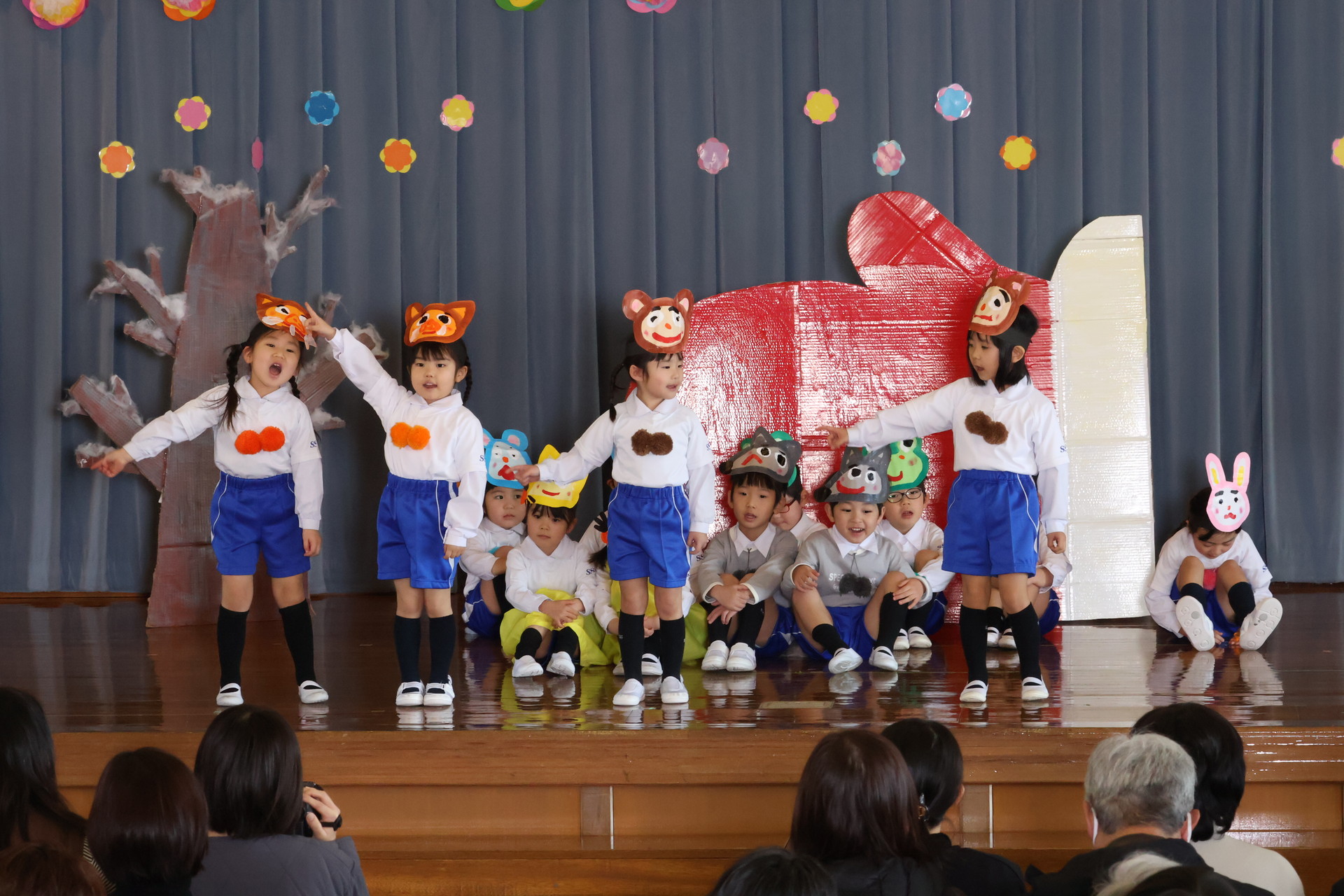 いままでお世話になった先生方やお家の方に、ありがとうの気持ちを込めて、各クラス、劇や踊りを披露しました。子どもたちの笑顔が溢れる温かい会でした。最後に、先生方やお家の方に、お花のプレゼントをしました。