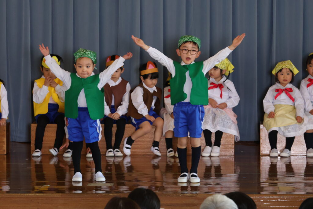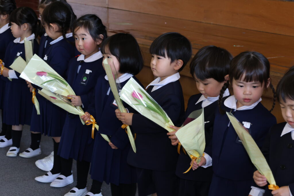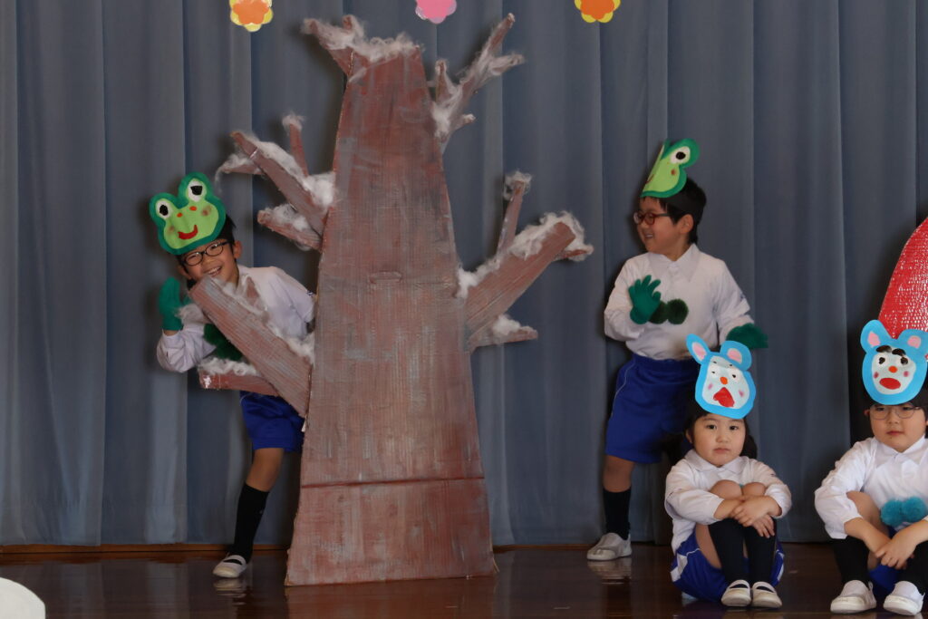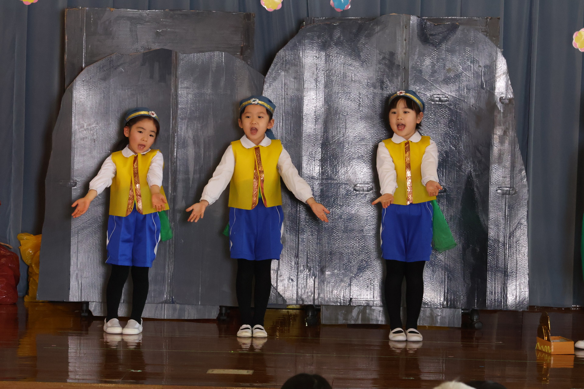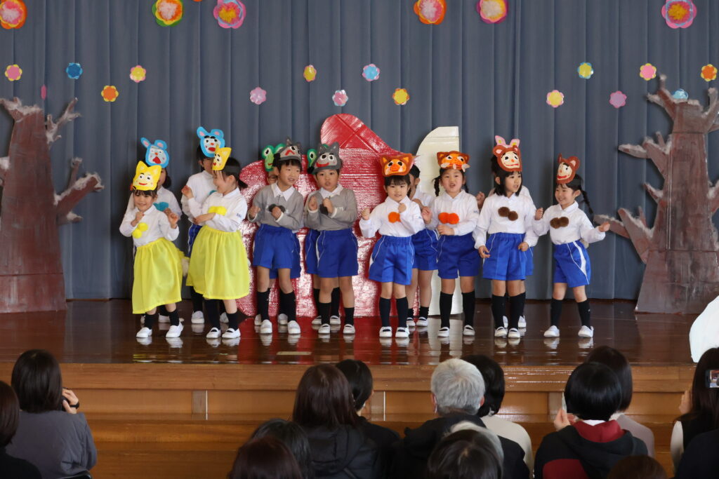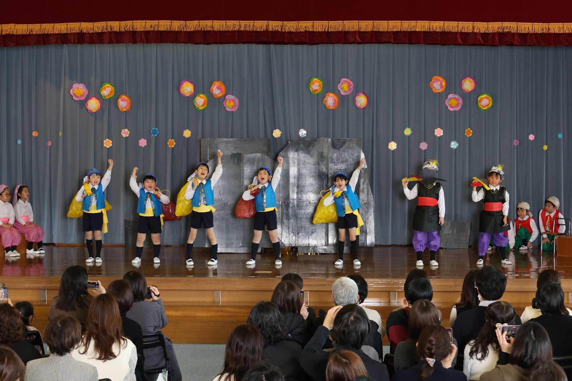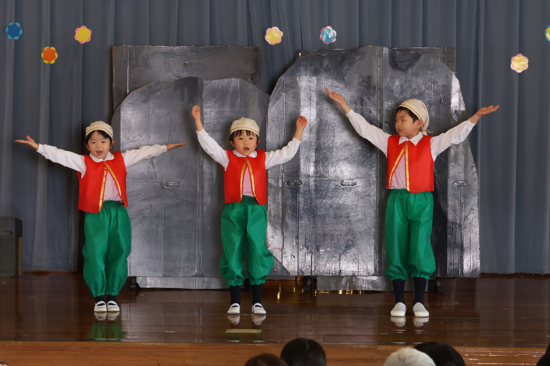 いままでお世話になった先生方やお家の方に、ありがとうの気持ちを込めて、各クラス、劇や踊りを披露しました。子どもたちの笑顔が溢れる温かい会でした。最後に、先生方やお家の方に、お花のプレゼントをしました。