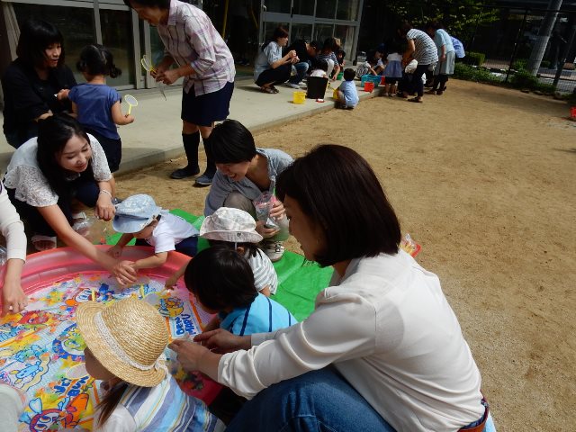お洗濯遊び、おもちゃの金魚すくい、シャボン玉をして遊びました。